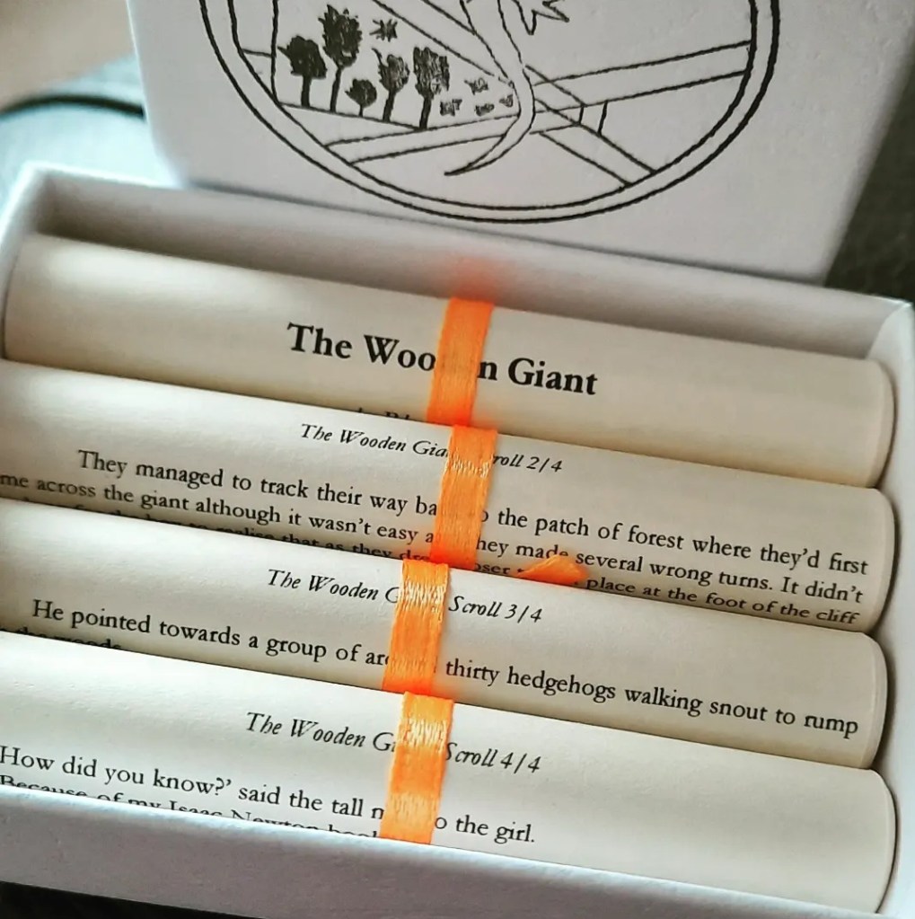 Whilst I have taken great care to package my tiny stories as beautifully as possible, with ribbons and stamps and lovely boxes, what’s most important to me is what’s printed on the scroll – the story. I’m an author whose books have been published all over the world and I have put everything into each and every story I sell. Some have taken several years to write, and some are little vignettes that came to me fully formed in one go. When you buy a story scroll I want you to receive a story of the highest possible quality, because stories are ways for souls to connect and the best of them make us feel less alone.